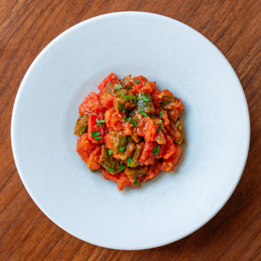 モロッコの温かい前菜、トゥクトゥーカ。表面が焦げるまで焼いて薄皮を剥いたピーマンやパプリカをトマトと合わせ、クミンで風味付けしたシンプルな一皿。本場モロッコのピーマンは、日本の一般的なピーマンより肉厚なものが多いため、日本で作る場合はピーマンより万願寺トウガラシを使うのがオススメです。