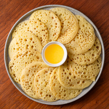 バグリールは、モロッコやアルジェリアで親しまれている"穴あきパンケーキ"。イースト発酵で生まれる無数の穴から、ハチミツやバターがじゅわっと染み込むのが最大の魅力です。セモリナ粉で作ることや、底面だけ焼いて表面は蒸し焼きのような形で火を通すのも特徴で、一般的なパンケーキとは異なる食感や味わいが楽しめます。