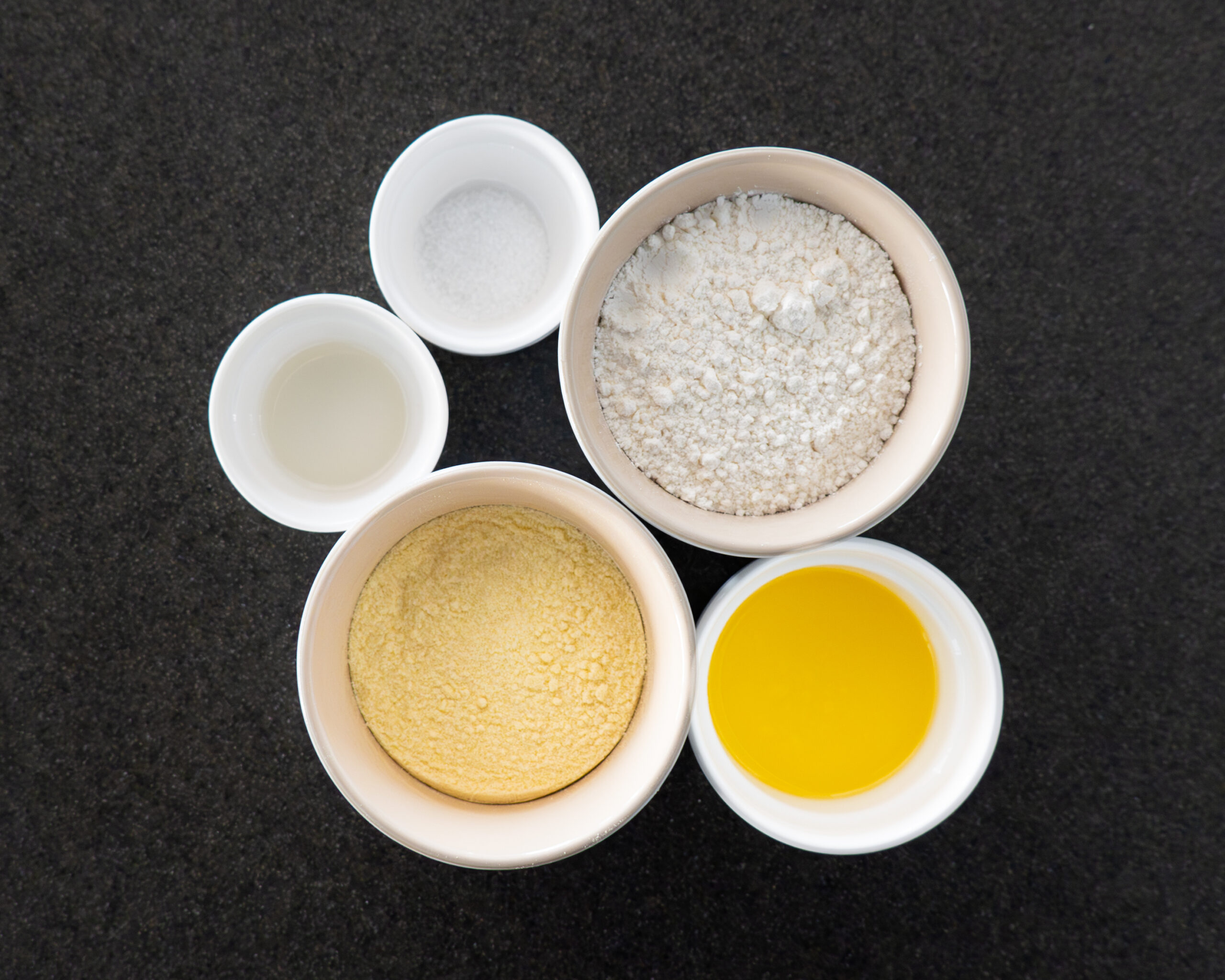 - ボウルにセモリナ粉、薄力粉、塩を入れてよく混ぜ合わせておく。
