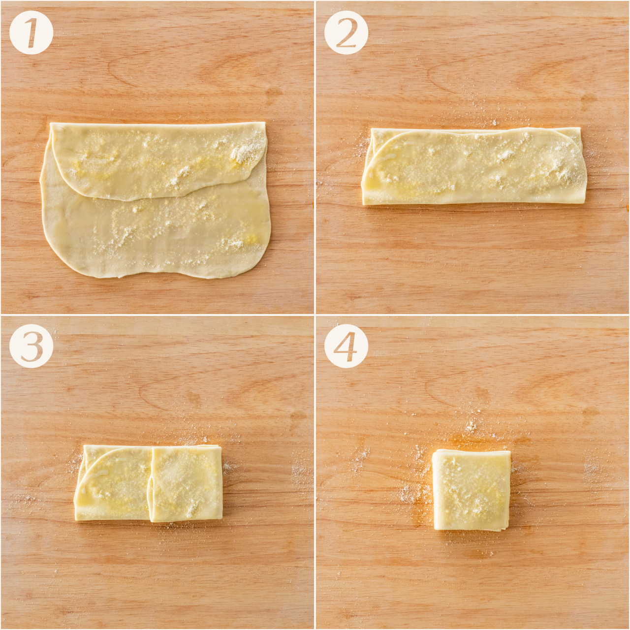 - 生地を上下左右に折りたたみ四角形に整える。折りたたむ度、表面に溶かしバターとセモリナ粉を少量ふりかける。